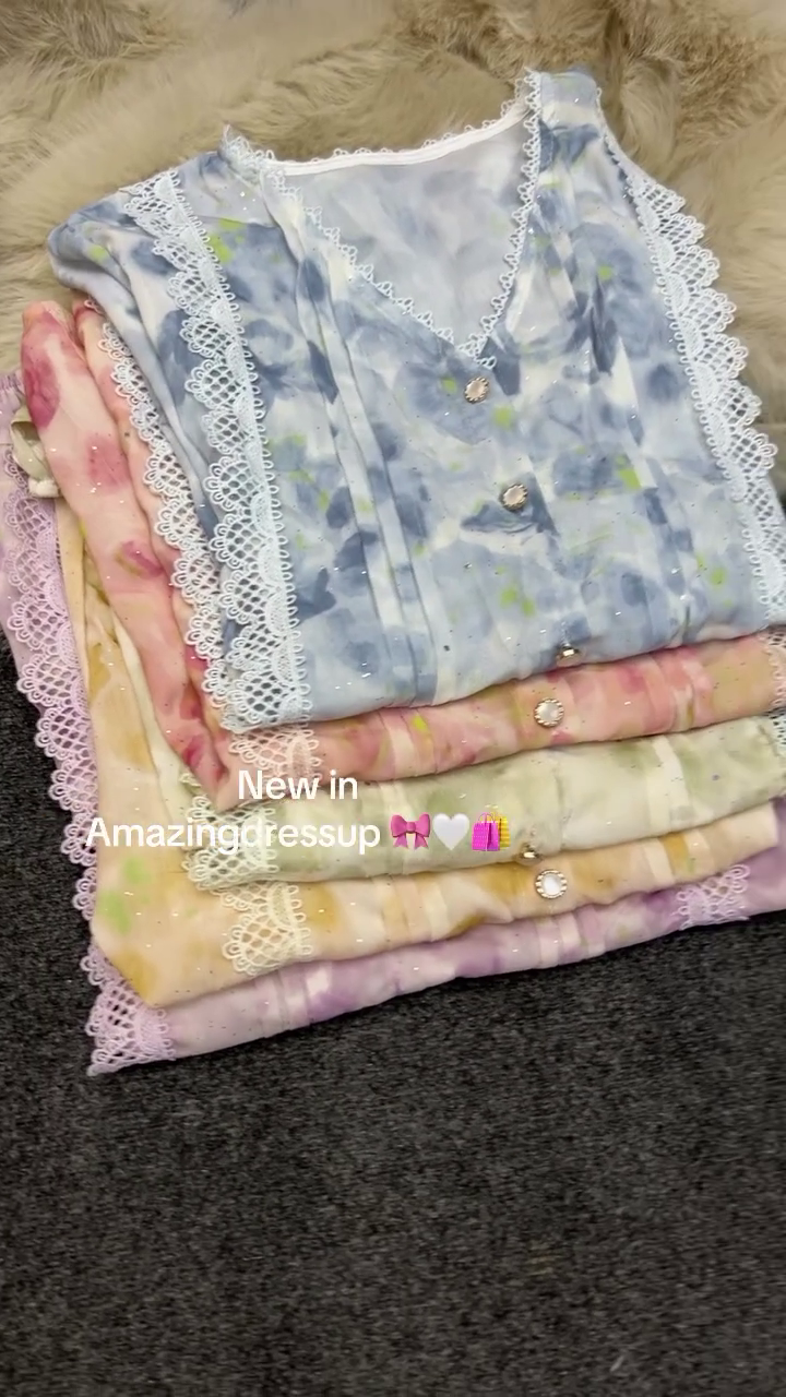 Each kurti is made from lightweight, breathable fabric that drapes beautifully and keeps you cool and comfortable throughout the day. Featuring an elegant V-neckline, these kurtis are enhanced with pearl-style buttons and subtle sequin sparkle scattered across the fabric — catching the light with every step.